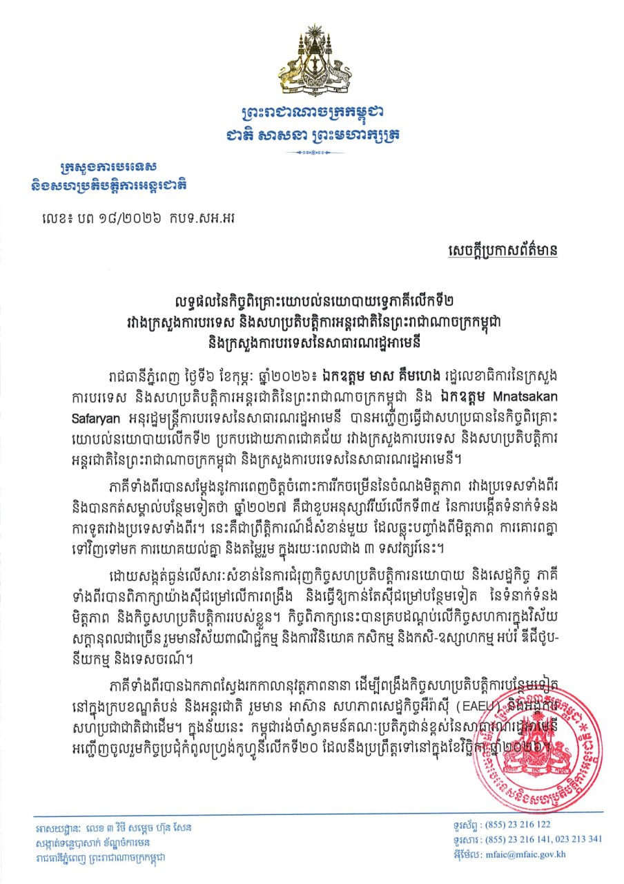 (ភ្នំពេញ)៖ បើតាមសេចក្តីប្រកាសព័ត៌មានរបស់ ក្រសួងការបរទេស និងសហប្រតិបត្តិការអន្តរជាតិកម្ពុជា ចេញផ្សាយនៅថ្ងៃទី១១ ខែកុម្ភៈ ឆ្នាំ២០២៦ បានឱ្យដឹងថា កម្ពុជា និងអាមេនី បន្តពង្រឹងកិច្ចសហប្រតិបត្តិការលើគ្រប់វិស័យ ដើម្បីលើកកម្ពស់មិត្តភាព និងការយោគយល់គ្នាទៅវិញទៅមក។ គួររំលឹកថា កាលពីថ្ងៃទី៦ ខែកុម្ភៈ ឆ្នាំ២០២៦ មាស គឹមហេង រដ្ឋលេខាធិការនៃក្រសួងការបរទេស និងសហប្រតិបត្តិការអន្តរជាតិនៃព្រះរាជាណាចក្រកម្ពុជា និង Mnatsakan Safaryan អនុរដ្ឋមន្ត្រីការបរទេសនៃសាធារណរដ្ឋអាមេនី បានអញ្ជើញធ្វើជាសហប្រធាននៃកិច្ចពិគ្រោះយោបល់នយោបាយលើកទី២ រវាងក្រសួងការបរទេសនៃប្រទេសទាំងពីរ ដែលប្រព្រឹត្តទៅប្រកបដោយភាពជោគជ័យ។ តាមសេចក្តីប្រកាសព័ត៌មានស្តីពីលទ្ធផលកិច្ចពិគ្រោះយោបល់នេះ ភាគីទាំងពីរ បានសម្តែងការពេញចិត្តចំពោះការរីកចម្រើននៃចំណងមិត្តភាពរវាងប្រទេសទាំងពីរ និងបានកត់សម្គាល់ថា ឆ្នាំ២០២៧ នឹងជាខួបអនុស្សាវរីយ៍លើកទី៣៥ នៃការបង្កើតទំនាក់ទំនងការទូតកម្ពុជា–អាមេនី ដែលឆ្លុះបញ្ចាំងពីមិត្តភាព ការគោរពគ្នាទៅវិញទៅមក ការយោគយល់ និងតម្លៃរួម ក្នុងរយៈពេលជាង ៣ ទសវត្សរ៍។ ដោយសង្កត់ធ្ងន់លើសារៈសំខាន់នៃការជំរុញកិច្ចសហប្រតិបត្តិការនយោបាយ និងសេដ្ឋកិច្ច ភាគីទាំងពីរ បានពិភាក្សាយ៉ាងស៊ីជម្រៅអំពីការពង្រឹងទំនាក់ទំនងមិត្តភាព និងកិច្ចសហប្រតិបត្តិការទ្វេភាគី ក្នុងវិស័យសក្តានុពលជាច្រើន រួមមាន ពាណិជ្ជកម្ម និងការវិនិយោគ កសិកម្ម និងកសិ-ឧស្សាហកម្ម អប់រំ ឌីជីថលនីយកម្ម និងទេសចរណ៍។ ភាគីទាំងពីរ ក៏បានឯកភាពស្វែងរកកាលានុវត្តភាពនានា ដើម្បីពង្រឹងកិច្ចសហប្រតិបត្តិការបន្ថែមទៀត នៅក្នុងក្របខណ្ឌតំបន់ និងអន្តរជាតិ រួមមាន អាស៊ាន, សហភាពសេដ្ឋកិច្ចអីរ៉ាស៊ី (EAEU) និង អង្គការសហប្រជាជាតិ។ ក្នុងន័យនេះ កម្ពុជា បានបញ្ជាក់ការរង់ចាំស្វាគមន៍គណៈប្រតិភូជាន់ខ្ពស់នៃសាធារណរដ្ឋអាមេនី អញ្ជើញចូលរួមកិច្ចប្រជុំកំពូលហ្វ្រង់កូហ្វូនី លើកទី២០ ដែលនឹងប្រព្រឹត្តទៅនៅខែវិច្ឆិកា ឆ្នាំ២០២៦។ ជាមួយគ្នានេះ ភាគីទាំងពីរ ក៏បានផ្លាស់ប្តូរយោបល់លើបញ្ហាតំបន់ និងអន្តរជាតិដែលជាកង្វល់រួម រួមទាំងស្ថានភាពព្រំដែនកម្ពុជា–ថៃ និងបានបញ្ជាក់ជាថ្មីនូវការប្តេជ្ញាចិត្ត ក្នុងការលើកកម្ពស់សន្តិភាព ស្ថិរភាព និងការអភិវឌ្ឍ ទាំងក្នុងតំបន់ និងលើសកលលោក ព្រមទាំងការគោរពសណ្តាប់ធ្នាប់អន្តរជាតិ ដែលផ្អែកលើច្បាប់។ កិច្ចពិគ្រោះយោបល់នយោបាយប្រកបដោយផ្លែផ្កានេះ បានបញ្ចប់ដោយសហប្រធានទាំងពីរ ឯកភាពគ្នាកំណត់ពេលវេលាសមស្រប សម្រាប់កិច្ចពិគ្រោះយោបល់នយោបាយជុំបន្ទាប់ នៅសាធារណរដ្ឋអាមេនី ក្នុងពេលឆាប់ៗខាងមុខ៕