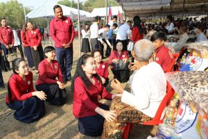 នាកិច្ចសំណេះសំណាលសួរសុខទុក្ខជាមួយប្រជាជនភៀសសឹកទាំងអស់ អ្នកម្ដាយមនុស្សធម៌ សម្តេចកិត្តិព្រឹទ្ធបណ្ឌិត ប៊ុន រ៉ានី ហ៊ុនសែន បានពាំនាំនូវព្រះរាជបន្ទូលរបស់ ព្រះករុណា ព្រះមហាក្សត្រ ជាអម្ចាស់ជីវិតលើត្បូង និងព្រះសវណីយ៍ សម្តេចព្រះមហាក្សត្រី ព្រះវររាជមាតាជាតិខ្មែរ ព្រះប្រធានកិត្តិយស កាកបាទក្រហមកម្ពុជា ជាទីគោរពសក្ការៈដ៏ខ្ពង់ខ្ពស់បំផុត ដែលព្រះអង្គទាំងទ្វេបានផ្តាំផ្ញើសួរសុខទុក្ខ និងក្តីនឹករលឹក ជាពិសេសការគិតគូរពីសុខទុក្ខប្រជានុរាស្ត្ររបស់ព្រះអង្គនៅគ្រប់ទីកន្លែង និងគ្រប់ពេលវេលា ព្រមទាំងសូមជូនពរបងប្អូនប្រជាពលរដ្ឋសូមមានសុខភាពល្អ ដើម្បីបន្តប្រកបរបរចិញ្ចឹមជីវិតតទៅមុខទៀត។
